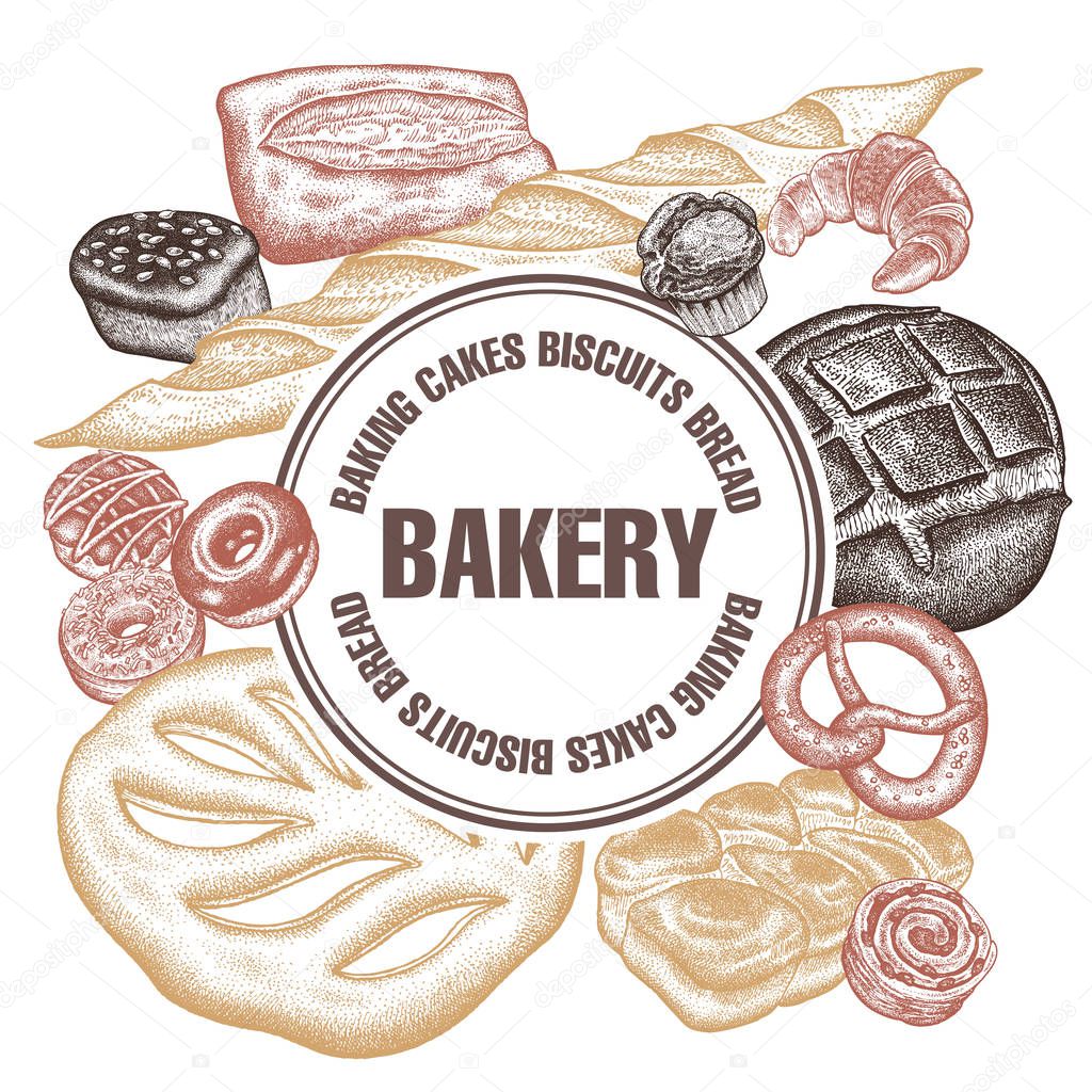 Frame Of Bakery Products With Space For Text Hand Drawing Variety Of Breads Buns Rye Bread French Baguettes Donuts Croissant Pretzel Vector Illustration Food Design For Confectionery Bakery Premium Vector In