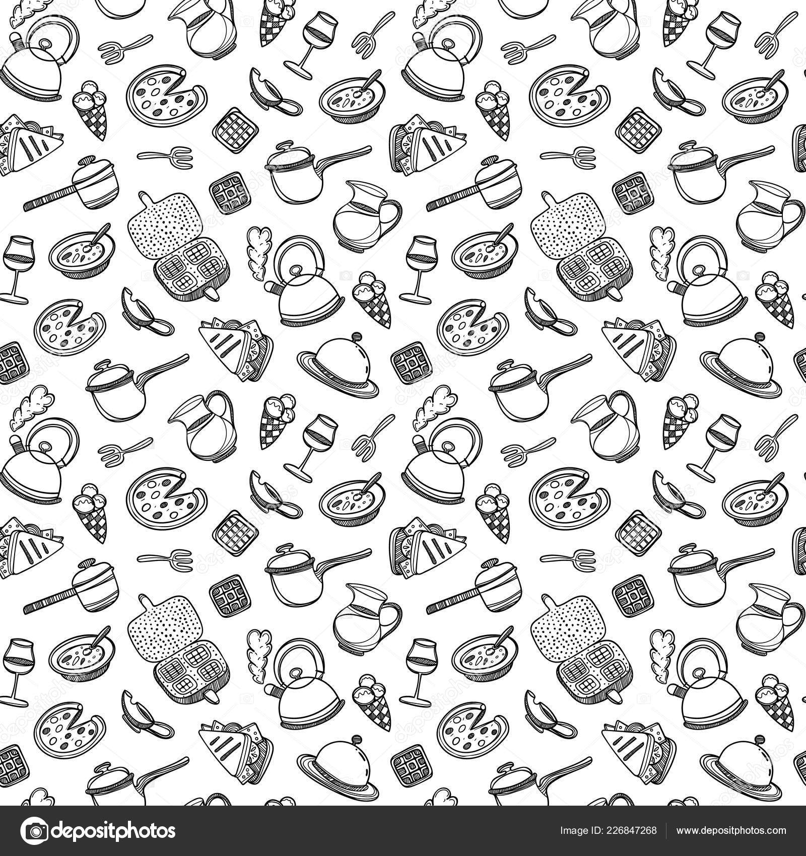 Cartoon Cute Food And Kitchenware On White Background Seamless Pattern Linear Illustration For Zentangle Book Stock Vector Illustration Of Homemade Clipart 128855757